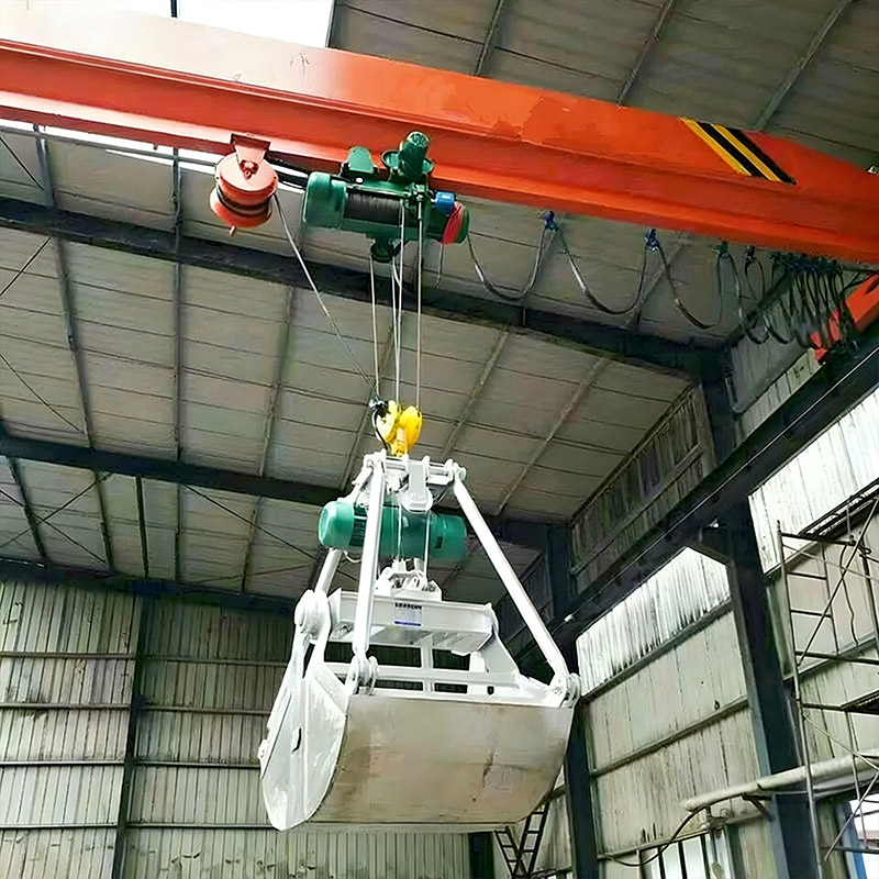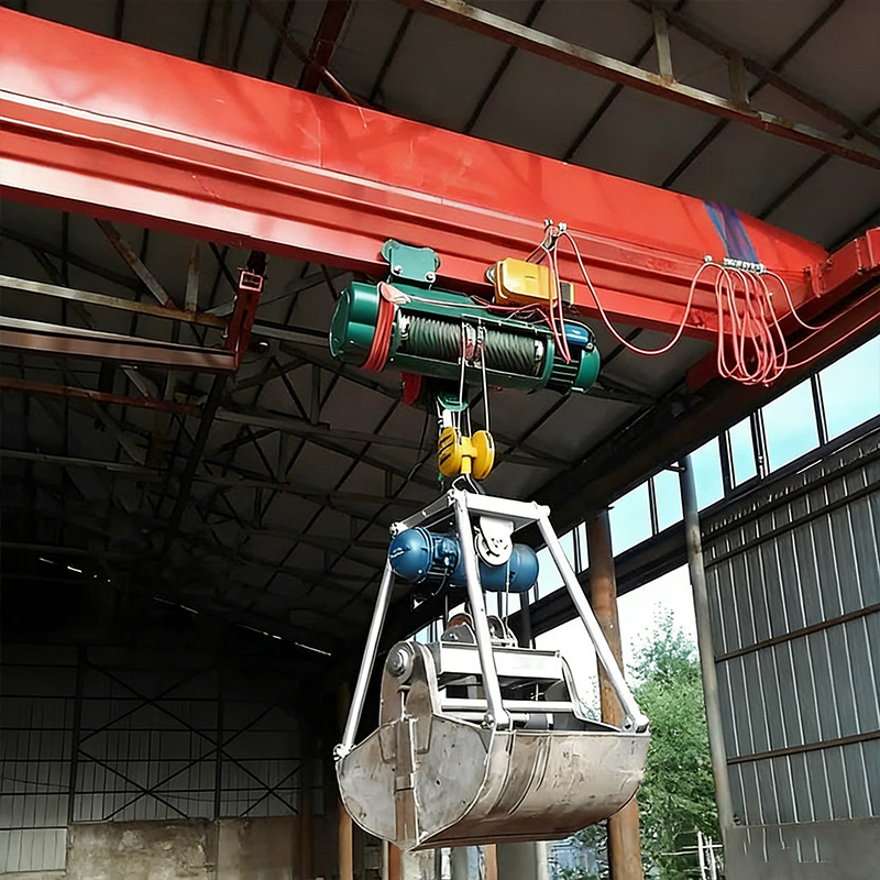 起重小車:沿主梁下翼緣軌道橫向移動。小車上的起升機構通過鋼絲繩控制抓斗的開降,開閉機構則控制抓斗的張開與閉合,以抓取和釋放物料。